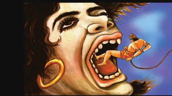 ಹನುಮಂತನು ವೇಗವಾಗಿ ಸಾಗುತ್ತಿರುವಾಗ, ಸುರಸೆಯು ವಿರಾಟ ರೂಪವನ್ನು ಧರಿಸಿ ದಾರಿಯನ್ನು ಅಡ್ಡಗಟ್ಟು ತ್ತಾಳೆ. ಅವಳು ಅಬ್ಬರಿಸುತ್ತಾ, “ಎಲೈ ವಾನರನೇ, ಇಂದು ದೇವತೆಗಳು ನಿನ್ನನ್ನು ನನಗೆ ಆಹಾರವಾಗಿ ನೀಡಿದ್ದಾರೆ. ನೀನು ನನ್ನ ಬಾಯಿಯೊಳಗೆ ಪ್ರವೇಶಿಸಲೇಬೇಕು" ಎಂದು ಬೆದರಿಸುತ್ತಾಳೆ.