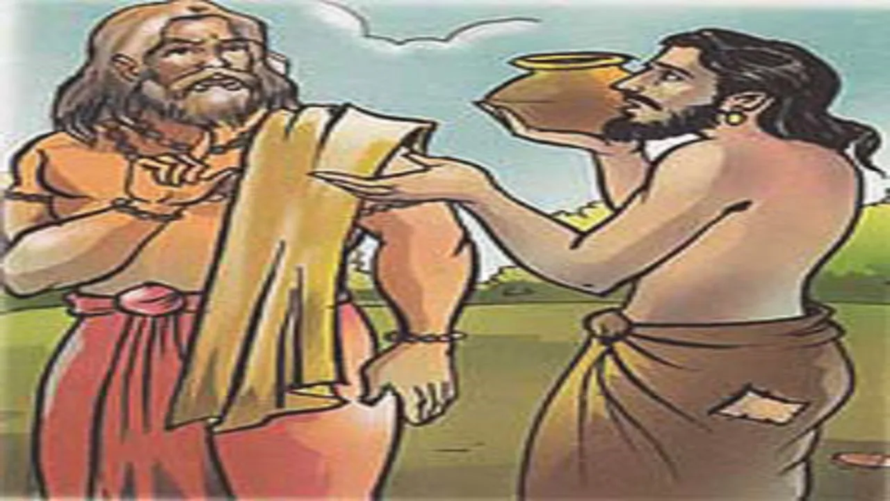 ಆಗ ಅವನ ಎದುರಿಗೆ ಒಬ್ಬ ಬೇಟೆಗಾರ ಬಂದನು. ಅವನ ಬಟ್ಟೆಬರೆಗಳು ಅಲ್ಲಲ್ಲಿ ಹರಿದು ಹೋಗಿ, ಮಾಸಿ ಧೂಳುಧೂಳಾಗಿದ್ದವು. ನಿಮಗೆ ನೀರಡಿಕೆಯಾದಂತೆ ತೋರುತ್ತದೆ. ಈ ಬೊಂಬಿನ ಕೊಳವೆ ಯಲ್ಲಿ ನೀರಿದೆ ಅದನ್ನು ಕುಡಿಯಿರಿ ಎಂದು ಹೇಳಿದನು. ಉತ್ತಂಕನು ಆ ಬೇಟೆಗಾರನೆಡೆಗೆ ಸಂದೇಹದಿಂದ ನೋಡಿದನು.