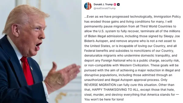 ಇದರ ಮೊದಲ ಹೆಜ್ಜೆಯಾಗಿ ಮೂರನೇ ಜಗತ್ತಿನ ದೇಶಗಳ ನಾಗರಿಕರ ವಲಸೆಯನ್ನು ಶಾಶ್ವತವಾಗಿ ನಿಲ್ಲಿಸಲು ತಮ್ಮ ಆಡಳಿತವು ಕೆಲಸ ಮಾಡುತ್ತದೆ. ಇದಕ್ಕಾಗಿ ಅಮೆರಿಕದ ವಲಸೆ ನೀತಿಯಲ್ಲಿ ಕಠಿಣ ಕ್ರಮಗಳನ್ನು ಸೇರಿಸಲಾಗುತ್ತಿದೆ ಎಂದು ಅವರು ತಿಳಿಸಿದರು.