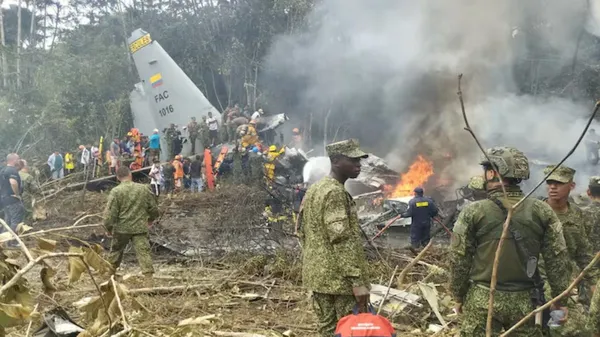 ಬೊಗಾಟ, ಮಾ. 24: 125 ಸೈನಿಕರು ಮತ್ತು ಸಿಬ್ಬಂದಿಯನ್ನು ಹೊತ್ತೊಯ್ಯುತ್ತಿದ್ದ ಕೊಲಂಬಿಯಾದ (Colombia) ಮಿಲಿಟರಿ ವಿಮಾನ ಸೋಮವಾರ (ಮಾ. 23) ಟೇಕ್ ಆಫ್ ಆಗುತ್ತಿದ್ದಂತೆ ಪತನಗೊಂಡು ಕನಿಷ್ಠ 66 ಮಂದಿ ಮೃತಪಟ್ಟು, 12ಕ್ಕೂ ಹೆಚ್ಚು ಜನರು ಗಾಯಗೊಂಡಿದ್ದಾರೆ. ಸಿ-130 ಹರ್ಕ್ಯುಲಸ್ ವಿಮಾನವು ಈಕ್ವೆಡಾರ್ ಮತ್ತು ಪೆರುವಿನ ದಕ್ಷಿಣ ಗಡಿಯ ಸಮೀಪವಿರುವ ಪೋರ್ಟೊ ಲೆಗುಯಿಜಾಮೊದಿಂದ ಹೊರಟ ಸ್ವಲ್ಪ ಸಮಯದ ನಂತರ ಪತನಗೊಂಡಿತು. ಕಾಡಿನಲ್ಲಿ ವಿಮಾನದ ಅವಶೇಷ ಪತ್ತೆಯಾಗಿದೆ.