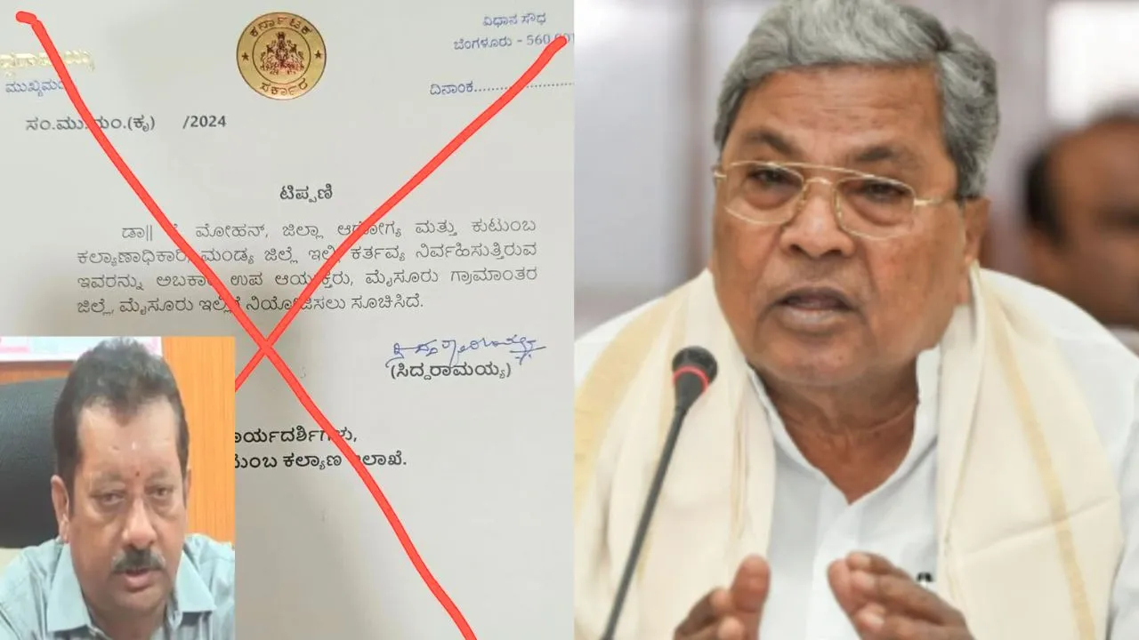 ಮುಖ್ಯಮಂತ್ರಿಯವರ ಹೆಸರಿನಲ್ಲಿ ಡಾ.ಕೆ. ಮೋಹನ್, ಜಿಲ್ಲಾ ಆರೋಗ್ಯ ಆರೋಗ್ಯ ಮತ್ತು ಕುಟುಂಬ ಕಲ್ಯಾಣಾಧಿಕಾರಿ, ಮಂಡ್ಯ ಜಿಲ್ಲೆ ಅವರನ್ನು ಅಬಕಾರಿ ಉಪ ಆಯುಕ್ತರು, ಮೈಸೂರು ಗ್ರಾಮಾಂತರ ಜಿಲ್ಲೆ ಮೈಸೂರಿಗೆ ನಿಯೋಜಿಸುವ ಕುರಿತ ಟಿಪ್ಪಣಿಯು ನಕಲಿ ಪತ್ರವಾಗಿದೆ.