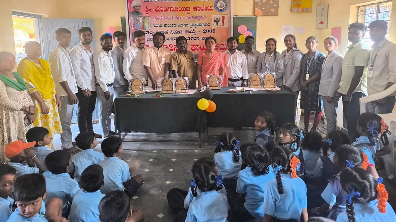 ಗೌರಿಬಿದನೂರು : ಬಾಲ್ಯ ವಿವಾಹ ಶಿಕ್ಷಾರ್ಹ ಅಪರಾಧವಾಗಿದ್ದು ಪೋಷಕರು ಯಾವ ಕಾರಣ ಕ್ಕೂ ಮಕ್ಕಳಿಗೆ 18 ವರ್ಷ ತುಂಬುವ ಮೊದಲೇ ಮದುವೆ ಮಾಡಬಾರದು ಎಂದು ಗ್ರಾಮ ಪಂಚಾ ಯಿತಿ ಸದಸ್ಯ, ಜಿ ಸೋಮಯ್ಯ ಮಾತನಾಡಿದರು. ತಾಲ್ಲೂಕಿನ ಇಡಗೂರು ಗ್ರಾಮದ ಸರ್ಕಾರಿ ಹಿರಿಯ ಪ್ರಾಥಮಿಕ ಪಾಠಶಾಲೆ ಆವರಣದಲ್ಲಿ ದೊಡ್ಡ ಬಳ್ಳಾಪುರದ, ಕೊಂಗಾಡಿಯಪ್ಪ ಕಾಲೇಜು ವಿದ್ಯಾರ್ಥಿಗಳಿಂದ, ಬಾಲ್ಯ ವಿವಾಹ ಕಾಯ್ದೆ, ಮತ್ತು ಬಾಲಕಾರ್ಮಿಕರ ನಿರ್ಮೂಲನೆ ಕಾಯ್ದೆಯ ಬಗ್ಗೆ ಅರಿವು ಮೂಡಿಸುವ ಕಾರ್ಯಕ್ರಮದಲ್ಲಿ ಭಾಗಿಯಾಗಿ ಮಾತನಾಡಿದರು.