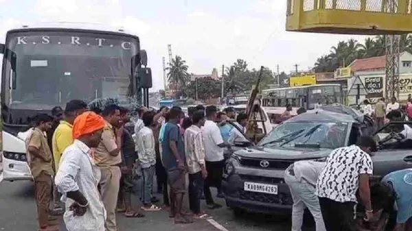 ಎಕ್ಸ್ಪ್ರೆಸ್ ಹೈವೇಯಿಂದ ಎಕ್ಸಿಟ್ ಆಗುವಾಗ ಟಾಟಾ ಪಂಚ್ ಕಾರು ಚಾಲಕನಿಗೆ ಗೊಂದಲವಾಗಿದೆ. ಹೀಗಾಗಿ ಮತ್ತೆ ಎಕ್ಸ್ಪ್ರೆಸ್ ಹೈವೇಗೆ ಕಾರು ತಿರುಗಿಸಿದ್ದಾರೆ. ಈ ವೇಳೆ ಹಿಂದಿನಿಂದ ವೇಗವಾಗಿ ಬರುತ್ತಿದ್ದ ಕೆಎಸ್ಆರ್ಟಿಸಿ ಐರಾವತ ಬಸ್ ಡಿಕ್ಕಿ ಹೊಡೆದಿದೆ. ಡಿಕ್ಕಿ ರಭಸಕ್ಕೆ ಕಾರು ಸಂಪೂರ್ಣ ನಜ್ಜುಗುಜ್ಜಾಗಿದೆ ಎಂದು ಪ್ರತ್ಯಕ್ಷದರ್ಶಿಗಳು ತಿಳಿಸಿದ್ದಾರೆ. ಈ ಬಗ್ಗೆ ಹೆಚ್ಚಿನ ಮಾಹಿತಿ ಕಲೆ ಹಾಕಲಾಗುತ್ತಿದೆ.