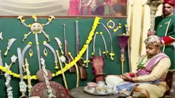 ದುರ್ಗಾದೇವಿ 18 ಕೈಗಳಲ್ಲಿ ಹಿಡಿದಿರುವ ಆಯುಧಗಳ ಪ್ರತೀಕವಾಗಿ 32 ಆಯುಧಗಳಿಗೆ ಪೂಜೆ ಸಲ್ಲಿಸಲಾಗುತ್ತದೆ. ಈ ಆಯುಧಗಳಿಗೆ ಪೂಜೆ ಸಲ್ಲಿಸಿದರೆ ರಾಜನಿಗೆ ಬಲ ಸಿಗುತ್ತದೆ, ವಿಜಯ ಪ್ರಾಪ್ತಿಯಾಗುತ್ತೆ ಎನ್ನುವ ನಂಬಿಕೆ ಇದೆ.