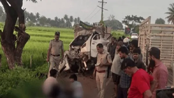 ಗೂಡ್ಸ್ ವಾಹನ ಮರಕ್ಕೆ ಡಿಕ್ಕಿ ಹೊಡೆದಿದೆ. ಮೂವರೂ ಬಾಳೆಹೊನ್ನೂರಿನಲ್ಲಿ ಕಾರ್ಪೆಂಟರ್ ಕೆಲಸ ಮುಗಿಸಿ ಗೂಡ್ಸ್ ವಾಹನದಲ್ಲಿ ವಾಪಸ್ ಆಗುವ ವೇಳೆ ಈ ಭೀಕರವಾದ ಅಪಘಾತ ಸಂಭವಿಸಿದೆ. ಚಾಲಕ ನಿದ್ದೆ ಮಂಪರಿನಲ್ಲಿ ವಾಹನ ಚಲಾಯಿಸಿ ನಿಯಂತ್ರಣ ಕಳೆದುಕೊಂಡಿರಬಹುದು ಎಂದು ಶಂಕಿಸಲಾಗಿದೆ. ಅದೃಷ್ಟವಶಾತ್ ಚಾಲಕ ಪ್ರಾಣಾಪಾಯದಿಂದ ಪಾರಾಗಿದ್ದು ಶಿವಮೊಗ್ಗದ ಮೆಗ್ಗಾನ್ ಆಸ್ಪತ್ರೆಗೆ ದಾಖಲಿಸಲಾಗಿದೆ. ಘಟನಾ ಸ್ಥಳಕ್ಕೆ ಶಿವಮೊಗ್ಗ ಗ್ರಾಮಾಂತರ ಪೊಲೀಸರು ಭೇಟಿ ನೀಡಿ ಪರಿಶೀಲನೆ ನಡೆಸುತ್ತಿದ್ದಾರೆ.
