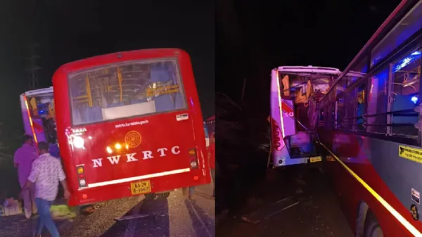 ರಾಷ್ಟ್ರೀಯ ಹೆದ್ದಾರಿ 48ರಲ್ಲಿ ಘಟನೆ ನಡೆದಿದೆ. ಕೆಎಸ್ಆರ್ಟಿಸಿ ಬಸ್ ಬಾಗಲಕೋಟೆ ಜಿಲ್ಲೆಯ ಹುನಗುಂದದಿಂದ ಬೆಂಗಳೂರು ಕಡೆಗೆ ತೆರಳುತ್ತಿತ್ತು. ಖಾಸಗಿ ಬಸ್ ಹುಬ್ಬಳ್ಳಿ ಕಡೆಯಿಂದ ಬೆಂಗಳೂರು ಕಡೆಗೆ ತೆರಳುತ್ತಿತ್ತು. ಓವರ್ಟೇಕ್ ಮಾಡಲು ಹೋಗಿ ಹಿಂಬದಿಯಿಂದ ಖಾಸಗಿ ಬಸ್ಗೆ ಕೆಎಸ್ಆರ್ಟಿಸಿ ಬಸ್ ಡಿಕ್ಕಿ ಹೊಡೆದಿದೆ. ಘಟನೆಯಲ್ಲಿ ಕೆಎಸ್ಆರ್ಟಿಸಿ ಬಸ್ನಲ್ಲಿದ್ದ 12 ಪ್ರಯಾಣಿಕರು ಹಾಗೂ ಖಾಸಗಿ ಬಸ್ನಲ್ಲಿದ್ದ 6 ಪ್ರಯಾಣಿಕರಿಗೆ ಸಣ್ಣಪುಟ್ಟ ಗಾಯಗಳಾಗಿವೆ.