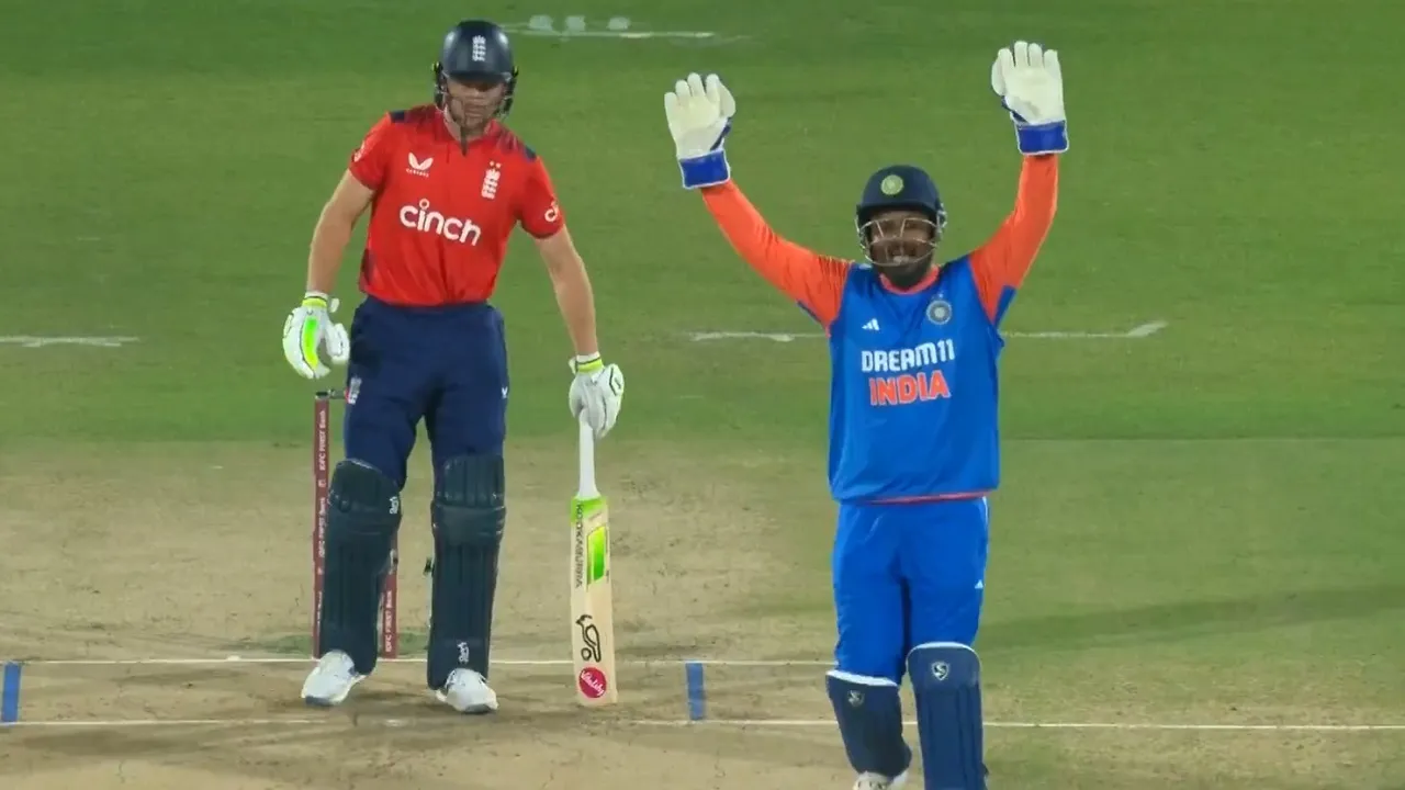 ಒಂದು ಹಂತದಲ್ಲಿ 22 ಎಸೆತಗಳಲ್ಲಿ 24 ರನ್ಗಳನ್ನು ಗಳಿಸಿ ಕ್ರೀಸ್ನಲ್ಲಿ ಗಟ್ಟಿಯಾಗಿ ನಿಂತಿದ್ದ ಇಂಗ್ಲೆಂಡ್ ನಾಯಕ ಜೋಸ್ ಬಟ್ಲರ್ ದೊಡ್ಡ ಇನಿಂಗ್ಸ್ ಆಡುವ ಮುನ್ಸೂಚನೆಯನ್ನು ನೀಡಿದ್ದರು. ಆದರೆ, 10ನೇ ಓವರ್ ಕೊನೆಯ ಎಸೆತದಲ್ಲಿ ವರುಣ್ ಚಕ್ರವರ್ತಿ ಎಸೆತವನ್ನು ಅರಿಯುವಲ್ಲಿ ವಿಫಲರಾದ ಜೋಸ್ ಬಟ್ಲರ್ ವಿಕೆಟ್ ಕೀಪರ್ ಸಂಜು ಸ್ಯಾಮ್ಸನ್ಗೆ ಕ್ಯಾಚ್ ಕೊಟ್ಟಿದ್ದರು. ಈ ವೇಳೆ ಸಂಜು ಸ್ಯಾಮ್ಸನ್ ಬಲವಾಗಿ ಅಫೀಲ್ ಮಾಡಿದ್ದರು. ಆದರೆ, ಫೀಲ್ಡ್ ಅಂಪೈರ್ ನಾಟ್ಔಟ್ ಕೊಟ್ಟಿದ್ದರು. ಇದರಿಂದ ತೃಪ್ತರಾಗದ ಸಂಜು ಸ್ಯಾಮ್ಸನ್, ಡಿಆರ್ಎಸ್ ತೆಗೆದುಕೊಳ್ಳಲು ನಾಯಕ ಸೂರ್ಯಕುಮಾರ್ ಯಾದವ್ ಮನವೋಲಿಸಿದ್ದರು.