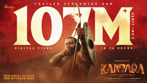 ಬೆಂಗಳೂರು: ಸೆಪ್ಟೆಂಬರ್ 22ರ ಮಧ್ಯಾಹ್ನ 12:45ಕ್ಕೆ ರಿಲೀಸ್ ಆದ ʼಕಾಂತಾರ: ಚಾಪ್ಟರ್ 1ʼ ಟ್ರೈಲರ್ (Kantara Chapter 1 Trailer) ಸೆಪ್ಟೆಂಬರ್ 23ರ ಮಧ್ಯಾಹ್ನ 12:45ಕ್ಕೆ ಹೊಸ ದಾಖಲೆ ಬರೆದುಬಿಟ್ಟಿದೆ. ಯೂಟ್ಯೂಬ್ ಸೇರಿ ವಿವಿಧ ಡಿಜಿಟಲ್ ಫ್ಲಾಟ್ಫಾರ್ಮ್ನಲ್ಲಿ ಬರೋಬ್ಬರಿ 107 ಮಿಲಿಯನ್ (10.7 ಕೋಟಿ) ವೀಕ್ಷಣೆ ಕಂಡಿದೆ. ಆ ಮೂಲಕ ರಿಷಬ್ ಶೆಟ್ಟಿ (Rishab Shetty) ನಟಿಸಿ, ನಿರ್ದೇಶಿಸಿರುವ ಚಿತ್ರ ಗಮನ ಸೆಳೆಯುವಲ್ಲಿ ಯಶಸ್ವಿಯಾಗಿದೆ. ಸದ್ಯ ʼಕಾಂತಾರ: ಚಾಪ್ಟರ್ 1ʼ ಟ್ರೈಲರ್ ನಾಗಾಲೋಟ ಮುಂದುವರಿದಿದೆ. ಕನ್ನಡದ ಜತೆಗೆ ಹಿಂದಿ, ಮಲಯಾಳಂ, ತಮಿಳು, ತೆಲುಗು ಮುಂತಾದ ಭಾಷೆಗಳಲ್ಲಿ ಟ್ರೈಲರ್ ಏಕಕಾಲಕ್ಕೆ ಮೂಡಿ ಬಂದಿದ್ದು, ಅಭಿಮಾನಿಗಳು ರೋಮಾಂಚನಗೊಂಡಿದ್ದಾರೆ. ಯೂಟ್ಯೂಬ್ ಜತೆಗೆ ಸೋಶಿಯಲ್ ಮೀಡಿಯಾದಲ್ಲಿಯೂ ಟ್ರೆಂಡಿಂಗ್ನಲ್ಲಿದೆ.