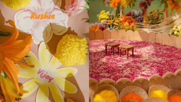 ‘ವಿಜಯ್’, ‘ರುಶಿ’ ಎಂದು ಬರೆದ ಕೃತಕ ಹೂವುಗಳಿಂದ ಸಿಂಗಾರ ಮಾಡಲಾಗಿತ್ತು. ಮಣ್ಣಿನ ಮಡಿಕೆಗಳಿಂದ ಮಾಡಿದ ಮಾದರಿ ಗಮನ ಸೆಳೆಯುತ್ತಿತ್ತು. ಗುಲಾಬಿಗಳು ಸೇರಿದಂತೆ ವಿವಿಧ ಹೂವುಗಳಿಂದ ಜಾಗವನ್ನು ಅಲಂಕರಿಸಲಾಗಿತ್ತು. ಗೋಡೆಗಳನ್ನು ಹೂವಿನ ಅಲಂಕಾರಗಳಿಂದ ಅಲಂಕರಿಸಲಾಗಿತ್ತು.