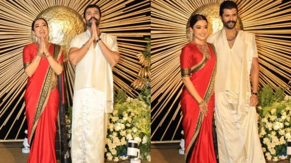 ರಶ್ಮಿಕಾ ಕೆಂಪು ರೇಷ್ಮೆ ಸೀರೆಯನ್ನು ಧರಿಸಿದ್ದರು. ವಿಜಯ್ ಕ್ಲಾಸಿಕ್ ಲುಕ್ನಲ್ಲಿ ಮಿಂಚಿದ್ದರು. ನಟ ಶರತ್ಕುಮಾರ್ ಮತ್ತು ಅವರ ಪತ್ನಿ ರಾಧಿಕಾ ಶರತ್ಕುಮಾರ್ ಕೂಡ ಸ್ಥಳಕ್ಕೆ ಆಗಮಿಸಿದ್ದರು.