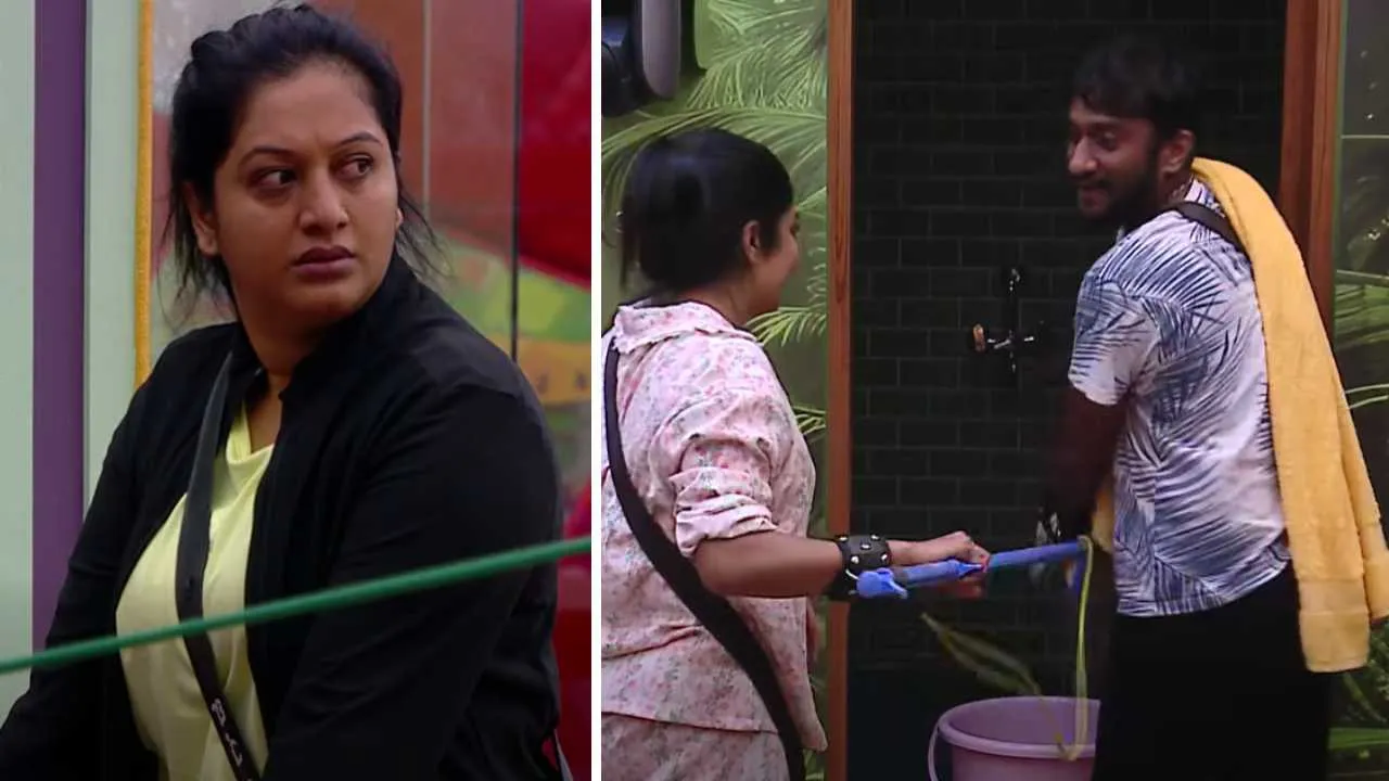 ಗಿಲ್ಲಿ ನಟ ಹಾಗೂ ಅಶ್ವಿನಿ ನಡುವೆ ಪದೇ ಪದೇ ಜಗಳ ಆಗುತ್ತಿದೆ. ಹಾಲ್ನಲ್ಲಿ ನಡೆದ ಈ ಜಗಳ ಇದೀಗ ಬಾತ್ರೂಮ್ ಏರಿಯಾಕ್ಕೂ ಬಂದಿದೆ. ಗಿಲ್ಲಿ-ಕಾವ್ಯಾ ಬಾತ್ ರೂಮ್ ಏರಿಯಾ ಕ್ಲೀನ್ ಮಾಡುತ್ತಿರುತ್ತಾರೆ. ಇವರನ್ನು ಕ್ಲೀನ್ ಮಾಡಿಸುವ ಕೆಲಸ ಒಂಟಿ ತಂಡದ್ದು. ಹೀಗಾಗಿ ಇವರಿಬ್ಬರು ಹೇಗೆ ಕ್ಲೀನ್ ಮಾಡುತ್ತಾರೆ ಎಂದು ನೋಡಿ ಕೊಳ್ಳಲು ಅಶ್ವಿನಿ ಬಂದಿದ್ದಾರೆ.