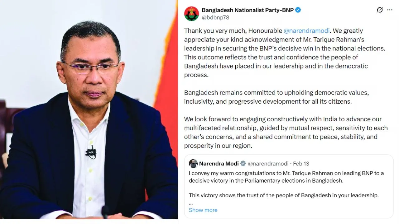 ಬಾಂಗ್ಲಾದೇಶದ ಚುನಾವಣೆ ಫಲಿತಾಂಶ ಶುಕ್ರವಾರ ಘೋಷಣೆಯಾದ ಬಳಿಕ ಪ್ರಧಾನಿ ನರೇಂದ್ರ ಮೋದಿ ಅವರು ತಾರಿಕ್ ರೆಹಮಾನ್ ಅವರೊಂದಿಗೆ ದೂರವಾಣಿ ಮೂಲಕ ಸಂಭಾಷಣೆ ನಡೆಸಿ ಶುಭ ಹಾರೈಸಿದರು. ಎರಡೂ ದೇಶಗಳ ಜನರ ಶಾಂತಿ, ಪ್ರಗತಿ ಮತ್ತು ಸಮೃದ್ಧಿಗೆ ಭಾರತದ ನಿರಂತರ ಬದ್ಧತೆಯನ್ನು ತೋರುವುದಾಗಿ ಭರವಸೆ ನೀಡಿದರು ಎನ್ನಲಾಗಿದೆ.