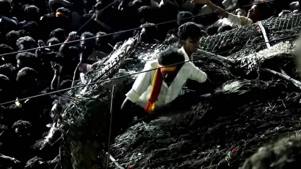 ಚೆನ್ನೈ: ತಮಿಳುನಾಡಿನ ಕರೂರಿನಲ್ಲಿ ನಟ-ರಾಜಕಾರಣಿ ವಿಜಯ್ ಅವರ ಪ್ರಚಾರ (Vijay's Rally Stampede) ರ್ಯಾಲಿಯಲ್ಲಿ ನಿನ್ನೆ (ಶುಕ್ರವಾರ) ಕಾಲ್ತುಳಿತ ಸಂಭವಿಸಿದ್ದು, 39 ಜನರು ಮೃತಪಟ್ಟಿದ್ದಾರೆ. ಸದ್ಯ ಕಾಲ್ತುಳಿತದ ಭಯಾನಕ ವಿಡಿಯೋಗಳು ವೈರಲ್ ಆಗುತ್ತಿದ್ದು, ಬೆಚ್ಚಿ ಬೀಳಿಸುವಂತಿದೆ. ರ್ಯಾಲಿಯಲ್ಲಿ ನೆರೆದಿದ್ದ ಜನ ಜೀವ ಉಳಿಸಿಕೊಳ್ಳಲು ಕಂಡ ಕಂಡಲ್ಲಿ ಓಡಿದ್ದಾರೆ. ವೀಡಿಯೊದಲ್ಲಿ, ವಿಜಯ್ ಅವರ ಪಕ್ಷದ ಧ್ವಜಗಳಲ್ಲಿ ಸುತ್ತುವರೆದ ಬಿಳಿ ಟಿ-ಶರ್ಟ್ಗಳನ್ನು ಧರಿಸಿದ ಹುಡುಗರು ಹುಲ್ಲಿನ ಛಾವಣಿಯ ಮೇಲೆ ಹತ್ತುವುದನ್ನು ಕಾಣಬಹುದು.