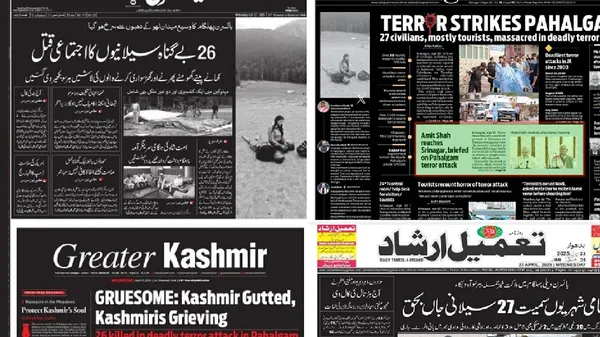 ಪಹಲ್ಗಾಮ್ನಲ್ಲಿ ನಡೆದ ಭೀಕರ ಭಯೋತ್ಪಾದಕ ದಾಳಿಯಲ್ಲಿ 26 ಜನರು ಸಾವನ್ನಪ್ಪಿದ್ದು, ಅವರಲ್ಲಿ ಹೆಚ್ಚಿನವರು ಪ್ರವಾಸಿಗರು ಎಂದು ಬುಧವಾರ ಕಾಶ್ಮೀರದ ಹಲವಾರು ಪ್ರಮುಖ ಪತ್ರಿಕೆಗಳು ತಮ್ಮ ಮುಖಪುಟಗಳನ್ನು ಕಪ್ಪು ಬಣ್ಣದಲ್ಲಿ ಮುದ್ರಿಸಿದವು. ಗ್ರೇಟರ್ ಕಾಶ್ಮೀರ್, ರೈಸಿಂಗ್ ಕಾಶ್ಮೀರ್, ಕಾಶ್ಮೀರ್ ಉಜ್ಮಾ, ಅಫ್ತಾಬ್ ಮತ್ತು ತಾಮೀಲ್ ಇರ್ಷಾದ್ ಸೇರಿದಂತೆ ಪ್ರಮುಖ ಇಂಗ್ಲಿಷ್ ಮತ್ತು ಉರ್ದು ದಿನಪತ್ರಿಕೆಗಳು