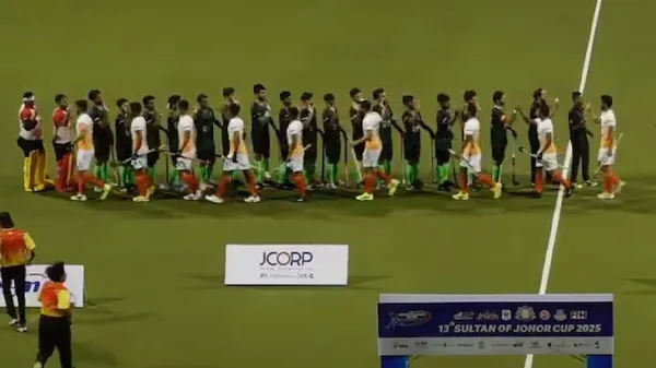 ಜೋಹರ್(ಮಲೇಷ್ಯಾ): ಮಲೇಷ್ಯಾದಲ್ಲಿ ನಡೆದ ಸುಲ್ತಾನ್ ಆಫ್ ಜೋಹರ್ ಕಪ್(Johor Cup 2025) ಕಿರಿಯರ ಹಾಕಿ ಟೂರ್ನಿಯಲ್ಲಿ, ಭಾರತ ಮತ್ತು ಪಾಕಿಸ್ತಾನದ(IND vs PAK) ಆಟಗಾರರು ಪರಸ್ಪರ ಕೈಕುಲುಕಿ, ಹೈ-ಫೈವ್ ಮಾಡಿ ಕ್ರೀಡಾ ಸ್ಫೂರ್ತಿ ಮೆರೆದರು. ಉಭಯ ತಂಡಗಳ ನಡುವಿನ ರೋಚಕ ಪಂದ್ಯವು 3-3 ಗೋಲುಗಳಿಂದ ಡ್ರಾದಲ್ಲಿ ಅಂತ್ಯಗೊಂಡಿತು.