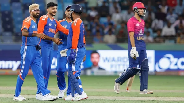 ಬುಧವಾರ ಇಲ್ಲಿನ ದುಬೈ ಇಂಟರ್ನ್ಯಾಷನಲ್ ಕ್ರೀಡಾಂಗಣದಲ್ಲಿ ಯುಎಇ ನೀಡಿದ್ದ 58 ರನ್ಗಳ ಗುರಿಯನ್ನು ಹಿಂಬಾಲಿಸಿದ ಭಾರತ ತಂಡ ಬಹುಬೇಗ ಗೆಲುವಿನ ದಡ ಸೇರಿತು. ಅಭಿಷೇಕ್ ಶರ್ಮಾ (30) ಹಾಗೂ ಶುಭಮನ್ ಗಿಲ್ (20*) ಅವರ ಸ್ಪೋಟಕ ಬ್ಯಾಟಿಂಗ್ ಬಲದಿಂದ ಕೇವಲ 4.3 ಓವರ್ಗಳಿಗೆ ಒಂದು ವಿಕೆಟ್ ನಷ್ಟಕ್ಕೆ 60 ರನ್ ಗಳಿಸಿ ಗೆದ್ದು ಬೀಗಿತು. ಐಪಿಎಲ್ ಟೂರ್ನಿಯಲ್ಲಿ ಬ್ಯಾಟಿಂಗ್ ಫಾರ್ಮ್ ಮುಂದುವರಿಸಿದ ಅಭಿಷೇಕ್ ಶರ್ಮಾ, ಕೇವಲ 16 ಎಸೆತಗಳಲ್ಲಿ 3 ಸಿಕ್ಸರ್ ಹಾಗೂ ಎರಡು ಬೌಂಡರಿಗಳೊಂದಿಗೆ 30 ರನ್ ಗಳಿಸಿ ವಿಕೆಟ್ ಒಪ್ಪಿಸಿದರು.