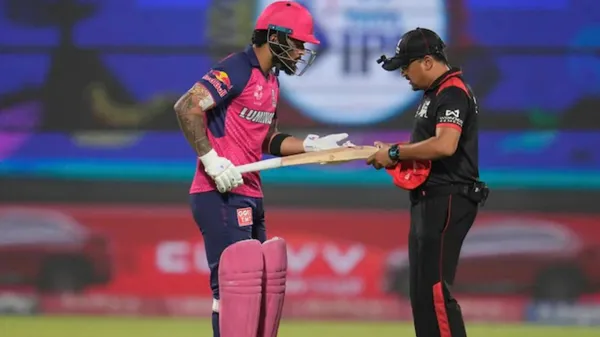 ನಾಯಕ ಸಂಜು ಸ್ಯಾಮ್ಸನ್ ಗಾಯಗೊಂಡು (ರಿಟರ್ಡ್ ಹರ್ಟ್) ಪೆವಿಲಿಯನ್ ಸೇರಿಕೊಂಡ ಬಳಿಕ ಬ್ಯಾಟಿಂಗ್ ನಡೆಸಲು ಬಂದ ಪರಾಗ್ ಅವರ ಬ್ಯಾಟನ್ನು ಅಂಪೈರ್ಗಳು ಪರಿಶೀಲಿಸಿದರು. ಈ ವೇಳೆ ಪರಾಗ್ ಬ್ಯಾಟ್ನ ಮಧ್ಯಭಾಗದಲ್ಲಿ ಉಬ್ಬು ಇದ್ದ ಕಾರಣ ಅಳತೆ ಮಾಪಕಕ್ಕೆ ಅಡ್ಡಿಯಾಯಿತು. ನಿಯಮದ ಪ್ರಕಾರ ಅಂಪೈರ್ ಪರಾಗ್ಗೆ ಈ ಬ್ಯಾಟ್ ಬಳಕೆಗೆ ಅವಕಾಶ ನೀಡಬಾರದಿತ್ತು. ಆದರೂ ಅವಕಾಶ ನೀಡಿದ ಬಗ್ಗೆ ಇದೀಗ ನೆಟ್ಟಿಗರು ಪ್ರಶ್ನಿಸಿದ್ದಾರೆ.