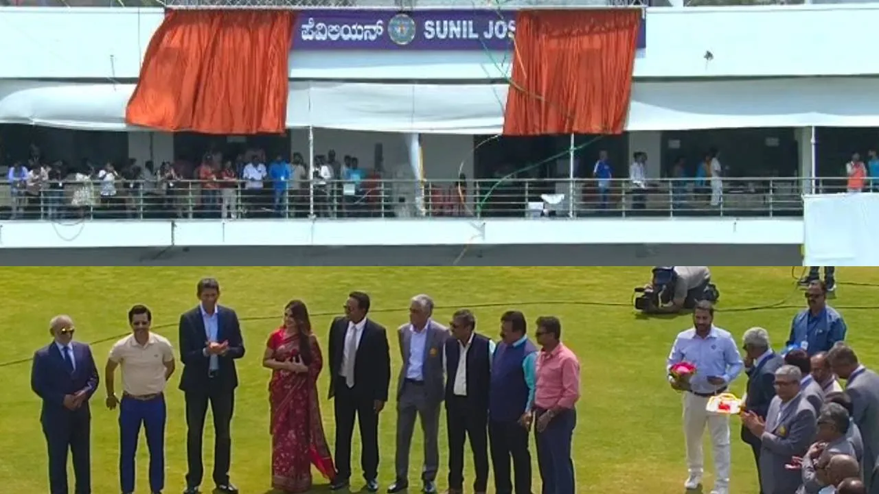 BCCI Hon. President Mr. @MithunManhas & KSCA President Mr. @venkateshprasad officially inaugurated the Sunil Joshi Pavilion at the KSCA Stadium in Hubli during the #RanjiTrophy Final! 🏟️@IDFCFIRSTBank | @kscaofficial1 |… pic.twitter.com/IcJazsgHjd