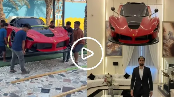 ಶ್ರೀಮಂತ ಉದ್ಯಮಿ ಕಾರನ್ನು ಛಾವಣಿ (ಸೀಲಿಂಗ್) ಗೆ ನೇತುಹಾಕಿದ್ದಾರೆ. @movlogs ಎಂಬ ಹೆಸರಿನ ಇನ್ಸ್ಟಾಗ್ರಾಂ ಪೇಜ್ನಲ್ಲಿ ವಿಡಿಯೋವನ್ನು ಅಪ್ಲೋಡ್ ಮಾಡಲಾಗಿದೆ. ವೈರಲ್ ಆಗಿರುವ ವಿಡಿಯೋದಲ್ಲಿ, ಪುರುಷರ ಗುಂಪೊಂದು ಕಾರನ್ನು ಎತ್ತಿಕೊಂಡು ಹೋಗುತ್ತಿರುವುದನ್ನು ಕಾಣಬಹುದು. ಕೆಂಪು ಬಣ್ಣದ ಕಾರನ್ನು ಮನೆಯೊಳಗೆ ಎತ್ತಿಕೊಂಡು ಹೋದ ತಂಡ, ಬಂಗಲೆಯ ಸೀಲಿಂಗ್ಗೆ ವಿದ್ಯುತ್ ದೀಪಗುಚ್ಛದಂತೆ ನೇತುಹಾಕಿದ್ದಾರೆ.