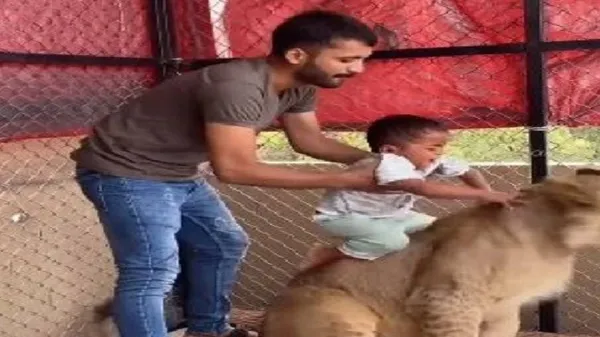 ವಿಡಿಯೊದಲ್ಲಿ, ವ್ಯಕ್ತಿಯೊಬ್ಬ ಸಿಂಹದ ಮೇಲೆ ಮಗುವನ್ನು ಕೂರಿಸಿ ಫೋಟೊ ತೆಗೆಯುವುದಕ್ಕೆ ನೋಡಿದ್ದಾನೆ. ಆಗ ಹೆದರಿದ ಮಗು ಜೋರಾಗಿ ಕೂಗಿದೆ. ಇದರಿಂದ ಸಿಂಹ ಕೂಡ ಕಿರಿಕಿರಿಗೊಂಡಿದೆ.