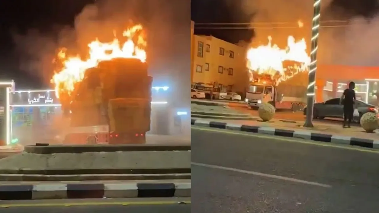 ಪಶು ಆಹಾರ ತುಂಬಿದ್ದ ಟ್ರಕ್ನಲ್ಲಿ ಇದ್ದಕ್ಕಿದ್ದಂತೆ ಬೆಂಕಿ ಕಾಣಿಸಿಕೊಂಡಿದ್ದು, ಸಂಭಾವ್ಯ ಅನಾಹುತವು ಸ್ವಲ್ಪದರಲ್ಲೇ ತಪ್ಪಿದೆ. ಮಹೇರ್ ಫಹದ್ ಅಲ್ ದಲ್ಬಾಹಿ ಎಂಬ ವ್ಯಕ್ತಿಯು ಕೂಡಲೇ ಬೆಂಕಿಯಿಂದ ಹೊತ್ತಿ ಉರಿಯುತ್ತಿರುವ ಟ್ರಕ್ಗೆ ಹಾರಿ, ಡ್ರೈವಿಂಗ್ ಸೀಟ್ನಲ್ಲಿ ಕುಳಿತಿದ್ದಾನೆ. ತಡಮಾಡದ ಆತ ಟ್ರಕ್ ಅನ್ನು ಪೆಟ್ರೋಲ್ ಬಂಕ್ನಿಂದ ದೂರ ತೆಗೆದುಕೊಂಡು ಹೋಗುವಲ್ಲಿ ಯಶಸ್ವಿಯಾಗಿದ್ದಾನೆ. ಮೈ ಜುಮ್ಮೆನ್ನಿಸುವ ಈ ದೃಶ್ಯವನ್ನು ಅಲ್ಲಿದ್ದ ಜನರು ತಮ್ಮ ಕ್ಯಾಮೆರಾದಲ್ಲಿ ಸೆರೆಹಿಡಿದಿದ್ದಾರೆ.