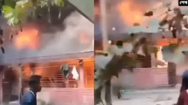 ಢಾಕಾ, ಜ.16: ಆಂತರಿಕ ಸಂಘರ್ಷದಲ್ಲಿ ನಲುಗಿರುವ ಬಾಂಗ್ಲಾದೇಶ(Bangladesh)ದಲ್ಲಿ ಹಿಂದೂಗಳ ಮೇಲಿನ ದೌರ್ಜನ್ಯ(Bangladesh Unrest) ಮುಂದುವರೆದಿದೆ. ಹಿಂದೂ ಶಿಕ್ಷಕರೊಬ್ಬರ ಮನೆಯನ್ನು ಗುರಿಯಾಗಿಸಿಕೊಂಡು ಬೆಂಕಿ ಹಚ್ಚಲಾಗಿದೆ. ದಾಳಿಕೋರರು ರಾತ್ರಿ ವೇಳೆ ಮನೆಗೆ ಬೆಂಕಿ ಹಚ್ಚಿದ ಘಟನೆ ಸಂಭವಿಸಿದೆ. ಅದೃಷ್ಟವಶಾತ್, ಘಟನೆಯ ಸಮಯದಲ್ಲಿ ಉಟುಂಬ ಸದಸ್ಯರು ಸುರಕ್ಷಿತವಾಗಿ ತಪ್ಪಿಸಿಕೊಳ್ಳುವಲ್ಲಿ ಯಶಸ್ವಿಯಾಗಿದ್ದಾರೆ. ಶಿಕ್ಷಕ ಬೀರೇಂದ್ರ ಕುಮಾರ್ ಎಂದು ಗುರುತಿಸಿಕೊಳ್ಳಲಾಗಿದೆ. ಘಟನೆಯ ವಿಡಿಯೊ ವೈರಲ್ ಆಗಿದೆ.