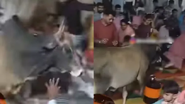 ಅಂತಹ ಒಂದು ಮದುವೆಯಲ್ಲಿ, ಆಹ್ವಾನಿಸದ ಅತಿಥಿಯೊಬ್ಬರು ಆಗಮಿಸುವವರೆಗೂ ಎಲ್ಲವೂ ಸಾಮಾನ್ಯವಾಗಿಯೇ ಇತ್ತು. ಅದ್ಯಾರು ಅತಿಥಿ ಎಂದು ಅಚ್ಚರಿ ಪಡುತ್ತಿದ್ದೀರೆ? ಅದ್ಯಾರೋ ವಧುವಿನ ಅಥವಾ ವರನ ಮಾಜಿ ಸಂಗಾತಿಯಲ್ಲ. ಅದ್ಧೂರಿ ಮದುವೆಗೆ ಕರೆಯದೇ ಬಂದ ಅತಿಥಿಯಿವರು. ಅದು ಬೇರ್ಯಾರು ಅಲ್ಲ, ಗೂಳಿ. ಕೆಲವೇ ಸೆಕೆಂಡುಗಳಲ್ಲಿ, ಮಂಟಪವು ಅವ್ಯವಸ್ಥೆಯಿಂದ ಕೂಡಿತು. ಪ್ರಶಾಂತ ಸಮಾರಂಭವಾಗಬೇಕಿದ್ದ ಸ್ಥಳ ಸಂಪೂರ್ಣ ಗೊಂದಲದ ಗೂಡಾಯಿತು. ಇದರ ವಿಡಿಯೊ ಸಾಮಾಜಿಕ ಮಾಧ್ಯಮದಲ್ಲಿ ವೈರಲ್ ಆಗಿದೆ.
