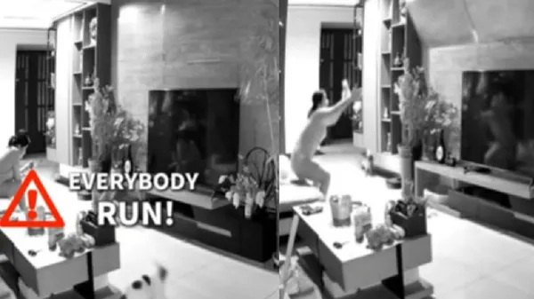 ಬೆಕ್ಕುಗಳು ವಿಲಕ್ಷಣ ಧ್ವನಿ ಮಾಡಿಕೊಂಡು, ಹೆದರಿ ಓಡಿ ಹೋಗುವುದನ್ನು ನೋಡಿ ಬೆಚ್ಚಿದ ಮಹಿಳೆ ತಾನು ಆ ಸ್ಥಳದಿಂದ ಓಡಲು ಮುಂದಾಗಿದ್ದಾಳೆ. ಈ ವೇಳೆ ಟಿವಿಯ ಹಿಂದಿನಿಂದ ಬೃಹತ್ ಟೈಲ್ಸ್ ಕೆಳಕ್ಕೆ ಬಿದ್ದಿದೆ. ಟೈಲ್ಸ್ ಬಿದ್ದ ಕೆಲವೇ ಸೆಕೆಂಡುಗಳಲ್ಲಿ ಮಹಿಳೆ ಮತ್ತು ಬೆಕ್ಕುಗಳು ಸ್ಥಳದಿಂದ ಓಡಿಹೋಗಿದ್ದಾರೆ.