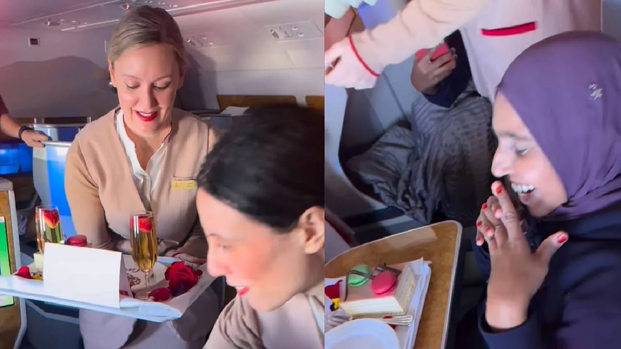 ವಿಮಾನದ ಒಳಗೆ ಎಮಿರೇಟ್ಸ್ ಕ್ಯಾಬಿನ್ನಲ್ಲಿದ್ದ ಮಹಿಳೆಯೊಬ್ಬರು ದಂಪತಿ ವಿವಾಹ ವಾರ್ಷಿಕೋತ್ಸವವನ್ನು ಆಚರಿಸುವ ಸಲುವಾಗಿ ಕೇಕ್, ವೈನ್ ಹಿಡಿದುಕೊಂಡು ಬರುತ್ತಿರುವ ದೃಶ್ಯವನ್ನು ಕಾಣಬಹುದು. ವೈರಲ್ ಆದ ವಿಡಿಯೊದಲ್ಲಿ ದಂಪತಿಯ ವಿವಾಹ ವಾರ್ಷಿಕೋತ್ಸವ ಇದ್ದ ಕಾರಣ ಪತಿ ಈ ಒಂದು ಸರ್ಪ್ರೈಸ್ ಸಲಬ್ರೇಶನ್ ಪ್ಲ್ಯಾನ್ ಮಾಡಿದ್ದು ತಿಳಿದುಬಂದಿದೆ. ಅದಕ್ಕೆ ವಿಮಾನದ ಸಿಬಂದಿ ಕೂಡ ಸಹಕರಿಸಿದ್ದನ್ನು ವಿಡಿಯೊದಲ್ಲಿ ಕಾಣಬಹುದು. ಪತಿ ತನಗೆ ಸರ್ಪ್ರೈಸ್ ನೀಡುತ್ತಿರುವುದನ್ನು ಅರಿಯದ ಮಹಿಳೆಯು ಕೇಕ್ ಕಂಡು ಶಾಕ್ ಆಗಿದ್ದಾರೆ. ಈ ವಿಡಿಯೊ ಸಾಮಾಜಿಕ ಮಾಧ್ಯಮದಲ್ಲಿ ಪ್ರಶಂಸೆ ಗಳಿಸುತ್ತಿದೆ.