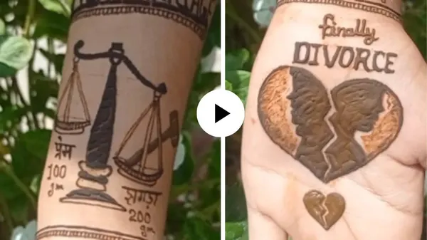 ನವದೆಹಲಿ: ಒಂದು ಕಾಲದಲ್ಲಿ ಡಿವೋರ್ಸ್ ಅನ್ನು ಬಹಳ ದುಃಖಕರ ಸಂಗತಿ ಎಂದು ಪರಿಗಣಿಸಲಾಗಿತ್ತು.ಆದರೆ ಇಂದಿನ ಕಾಲದಲ್ಲಿ ಡಿವೋರ್ಸ್ ಪಡೆದು ಅದನ್ನು ಖುಷಿಯಿಂದ ಸೆಲೆಬ್ರೆಟ್ ಮಾಡುತ್ತಾರೆ.ಇದಕ್ಕೆ ಸಂಬಂಧಪಟ್ಟ ವಿಡಿಯೊ ಕೂಡ ಸೋಶಿಯಲ್ ಮೀಡಿಯಾದಲ್ಲಿ ಆಗಾಗ ವೈರಲ್ ಆಗುತ್ತಿರುತ್ತದೆ. ಇಲ್ಲೊಬ್ಬಳು ಮಹಿಳೆ ಡಿವೋರ್ಸ್ ಪಡೆದ ನಂತರ ಕೈಗೆ ಮೆಹೆಂದಿ ಹಾಕಿಕೊಂಡು ಖುಷಿಯಿಂದ ಪಾರ್ಟಿ ಮಾಡುವ ಮೂಲಕ ಸೆಲೆಬ್ರೆಟ್ ಮಾಡಿದ್ದಾಳೆ. ಈ ವಿಡಿಯೊ ಈಗ ಸೋಶಿಯಲ್ ಮೀಡಿಯಾದಲ್ಲಿ ಸಿಕ್ಕಾಪಟ್ಟೆ ವೈರಲ್(Viral Video) ಆಗಿದ್ದು, ನೆಟ್ಟಿಗರು ಶಾಕ್ ಆಗಿದ್ದಾರೆ. ವೈರಲ್ ಆದ ವಿಡಿಯೊದಲ್ಲಿ ಆಕೆ ಕೈಗೆ ಹಾಕಿದ ಮೆಹಂದಿ ಡಿಸೈನ್ ಬ್ರೈಡಲ್ ಮೆಹೆಂದಿ ಡಿಸೈನ್ ಆಗಿರಲಿಲ್ಲ. ಬದಲಾಗಿ, ಆ ಮೆಹಂದಿ ಡಿಸೈನಲ್ಲಿ "100 ಗ್ರಾಂ ಪ್ರೀತಿ", "200 ಗ್ರಾಂ ಜಗಳ", ಮತ್ತು ನ್ಯಾಯದ ತಕ್ಕಡಿಗೆ ಸಂಬಂಧಪಟ್ಟ ಚಿತ್ರಗಳಿತ್ತು.