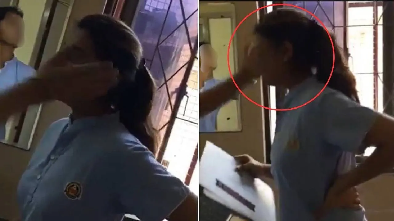 ಈ ಘಟನೆಯು ನೀಲಿ ಪೋಲೋ ಟಿ-ಶರ್ಟ್ ಧರಿಸಿದ ಹುಡುಗಿ ಇನ್ನೊಬ್ಬ ವಿದ್ಯಾರ್ಥಿನಿಯನ್ನು ಅಡ್ಡಗಟ್ಟಿ ನಿನ್ನ ಹೆಸರೇನು? ಎಂದು ಕೇಳಿದ್ದು ಇನ್ನೊಬ್ಬಳು ಅವಳ ಪ್ರತಿಕ್ರಿಯೆಯೂ ಸಹ ಸಾಕಷ್ಟು ಆಕ್ರಮಣಕಾರಿಯಾಗಿದೆ, "ತೇರೆ ಬಾಪ್ ಕೋ ಪತಾ ಹೈ." ನಿನ್ನ ತಂದೆಗೆ ಗೊತ್ತು ಎಂದು ಹೇಳುತ್ತಾಳೆ. ಇದರಿಂದ ಕೆರಳಿದ ವಿದ್ಯಾರ್ಥಿ ಆಕೆಯ ಕೆನ್ನೆಗೆ ಬಾರಿಸಿದ್ದಾಳೆ.ಈ ಹೇಳಿಕೆಯು ತಕ್ಷಣವೇ ಉದ್ವಿಗ್ನತೆಯನ್ನು ಹೆಚ್ಚಿಸುವಂತೆ ಕಾಣುತ್ತದೆ.