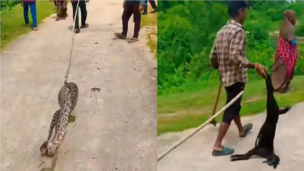 ನಂತರ ಗ್ರಾಮಸ್ಥರು ಮೇಕೆ ಮತ್ತು ಹೆಬ್ಬಾವನ್ನು ರಸ್ತೆಯ ಮೇಲೆ ಎಳೆದುಕೊಂಡು ಹೋಗಿದ್ದಾರೆ. ವಿಡಿಯೊದಲ್ಲಿ ಒಬ್ಬ ಗ್ರಾಮಸ್ಥರು ಕಪ್ಪು ಮೇಕೆಯ ಮೃತದೇಹವನ್ನು ಎಳೆದುಕೊಂಡು ಹೋಗುತ್ತಿರುವುದನ್ನು ಮತ್ತು ಇನ್ನೊಬ್ಬರು ಸತ್ತ ಹಾವನ್ನು ಉದ್ದನೆಯ ಕೋಲಿನಿಂದ ಎಳೆಯುತ್ತಿರುವುದನ್ನು ಕಾಣಬಹುದು.