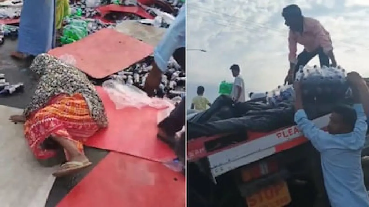 ಆಂಧ್ರಪ್ರದೇಶದ ನೆಲ್ಲೂರಿನಲ್ಲಿ ಈ ಘಟನೆ ನಡೆದಿದೆ. ಟ್ರಕ್ ತಂಪು ಪಾನೀಯಗಳ ಬಾಟಲಿಗಳಿಂದ ತುಂಬಿತ್ತು. ಚಾಲಕನ ನಿಯಂತ್ರಣ ತಪ್ಪಿ ವಾಹನ ಉರುಳಿ ಬಿದ್ದಿದೆ. ಜನರು ಬಾಟಲಿಗಳನ್ನು ಕೊಂಡೊಯ್ಯಲು ಧಾವಿಸುತ್ತಿರುವುದನ್ನು, ಕೆಲವರು ಸಾಧ್ಯವಾದಷ್ಟು ತಂಪು ಪಾನೀಯಗಳನ್ನು ಸಂಗ್ರಹಿಸಲು ಓಡುತ್ತಿರುವುದನ್ನು ಕಾಣಬಹುದು.
