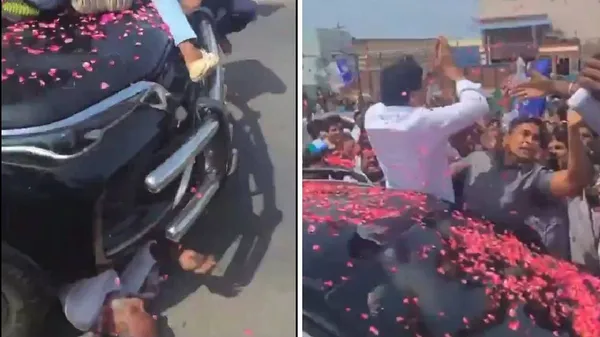 ಅಮರಾವತಿ: ಆಂಧ್ರ ಪ್ರದೇಶದ ವಿಜಯವಾಡದಲ್ಲಿ ದಾರುಣ ಘಟನೆಯೊಂದು ನಡೆದಿದ್ದು, ಮಾಜಿ ಮುಖ್ಯಮಂತ್ರಿ, ವೈಎಸ್ಆರ್ಸಿಪಿ ಮುಖಂಡ ಜಗನ್ ಮೋಹನ್ ರೆಡ್ಡಿ (Y.S.Jagan Mohan Reddy) ಅವರಿದ್ದ ವಾಹನಕ್ಕೆ ಸಿಲುಕಿ ವ್ಯಕ್ತಿಯೊಬ್ಬರು ಮೃತಪಟ್ಟಿದ್ದಾರೆ. ಮೃತರನ್ನು 54 ವರ್ಷದ ಚೀಲಿ ಸಿಂಗಯ್ಯ (Cheeli Singaiah) ಎಂದು ಗುರುತಿಸಲಾಗಿದೆ. ಜೂ. 18ರಂದು ನಡೆದ ಈ ಘಟನೆ ತಡವಾಗಿ ಬೆಳಕಿಗೆ ಬಂದಿದೆ. ಸದ್ಯ ಘಟನೆಯ ವಿಡಿಯೊ ಸೋಶಿಯಲ್ ಮೀಡಿಯಾದಲ್ಲಿ ವೈರಲ್ ಆಗಿದೆ (Viral Video). ಚೀಲಿ ಸಿಂಗಯ್ಯ ಬಿದ್ದಿರುವುದು ಗಮನಕ್ಕೆ ಬಾರದೆ ಅವರ ಮೇಲೆಯೇ ಕಾರಿ ಹರಿದು ಹೋಗಿರುವ ದೃಶ್ಯ ವಿಡಿಯೊದಲ್ಲಿ ಸೆರೆಯಾಗಿದೆ.