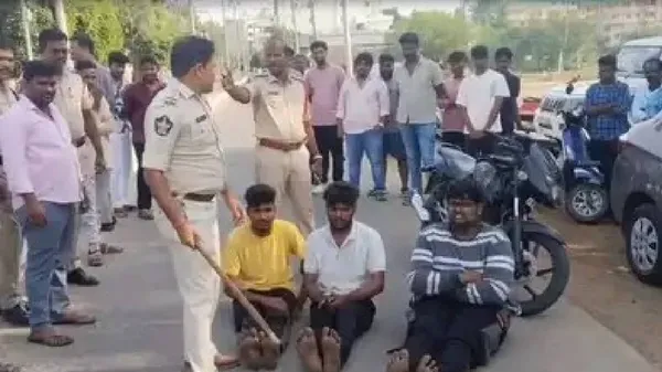 ತೆಲಂಗಾಣ: ಆಂಧ್ರಪ್ರದೇಶದ ತೆನಾಲಿ ಹೆದ್ದಾರಿಯಲ್ಲಿ ಪೊಲೀಸರು ಮೂವರ ಯುವಕರ ಕಾಲುಗಳನ್ನು ಹಗ್ಗದಿಂದ ಬಿಗಿಯಾಗಿ ಕಟ್ಟಿಹಾಕಿ ನಡು ರಸ್ತೆಯಲ್ಲಿ ಕೂರಿಸಿ ಅವರಿಗೆ ಬೆತ್ತದಿಂದ ಥಳಿಸಿದ ಘಟನೆಯೊಂದು ನಡೆದಿದೆ. ಇದಕ್ಕೆ ಸಂಬಂಧಪಟ್ಟ ವಿಡಿಯೊ ಸೋಶಿಯಲ್ ಮೀಡಿಯಾದಲ್ಲಿ ಸಿಕ್ಕಾಪಟ್ಟೆ ವೈರಲ್ ಆಗಿದೆ. ಕಾನ್ಸ್ಟೇಬಲ್ ಮೇಲೆ ಹಲ್ಲೆ ಮಾಡಿದ್ದಕ್ಕಾಗಿ ಪೊಲೀಸರು ಅವರಿಗೆ ತಕ್ಕ ಪಾಠ ಕಲಿಸಲು ಸಾರ್ವಜನಿಕವಾಗಿ ಥಳಿಸಿದ್ದಾರಂತೆ.ಆರೋಪಿಗಳಾದ ಚೆಬ್ರೋಲು ಜಾನ್ ವಿಕ್ಟರ್ (25), ಶೇಕ್ ಬಾಬುಲಾಲ್ (21) ಮತ್ತು ದೋಮ ರಾಕೇಶ್ (25) ಲಡ್ಡು ಎಂಬ ಪ್ರಸಿದ್ಧ ರೌಡಿಶೀಟರ್ನ ಸಹಚರರಾಗಿದ್ದು, ಒಂದು ತಿಂಗಳ ಹಿಂದೆ ಐತಾನಗರದಲ್ಲಿ ಮಾದಕ ದ್ರವ್ಯಗಳನ್ನು ಸೇವಿಸಿ ಕಾನ್ಸ್ಟೇಬಲ್ ಚಿರಂಜೀವಿಯ ಮೇಲೆ ಹಲ್ಲೆ ನಡೆಸಿದ್ದಾರಂತೆ.