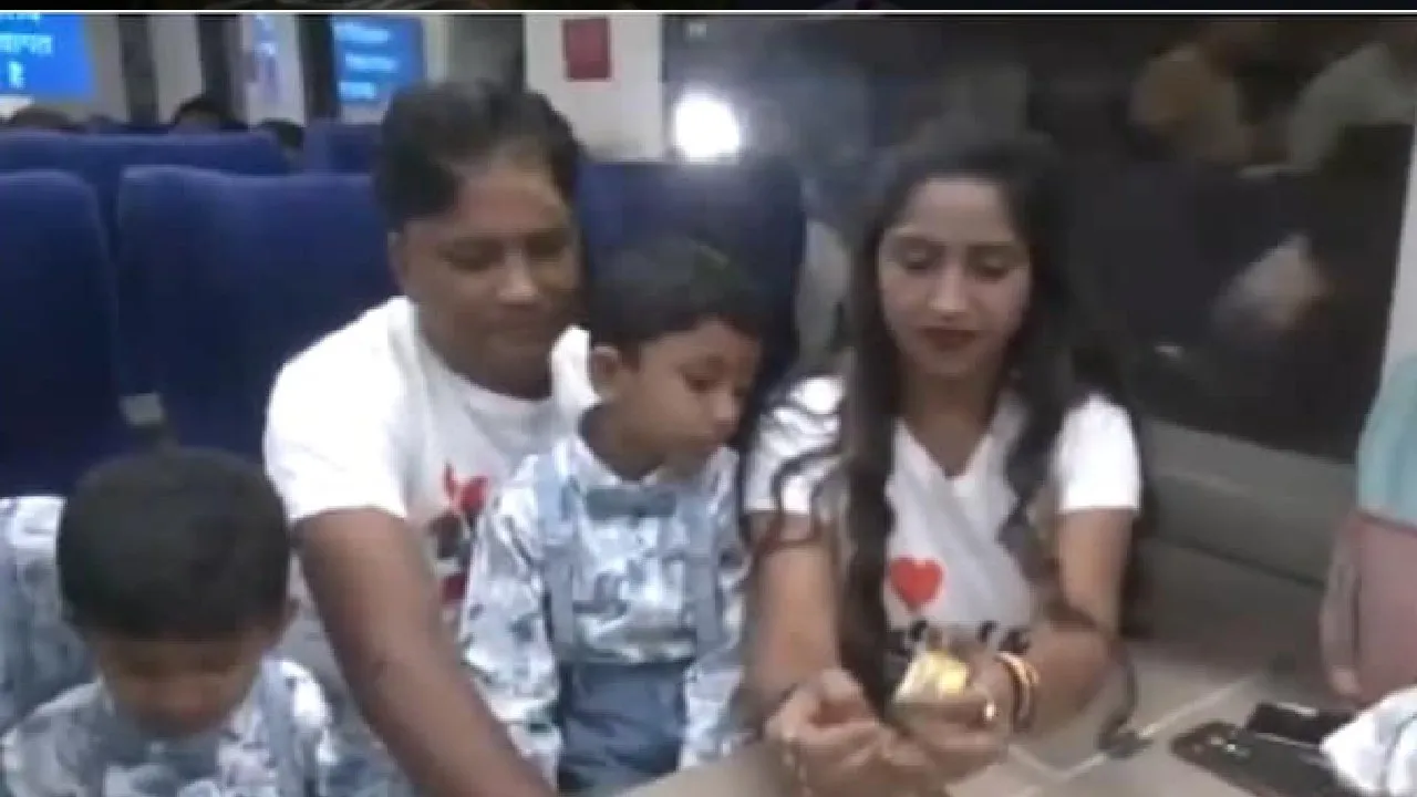 #WATCH | A couple, Rakesh and Neha Jaiswal from Varanasi, celebrate their son Moksh's sixth birthday inside Kashmir's first Vande Bharat express train, cutting the cake as the train reaches Anji Khad Bridge, inaugurated by PM Narendra Modi yesterday.