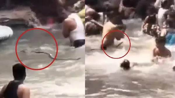 ಡೆಹ್ರಡೂನ್: ಇತ್ತೀಚೆಗೆ ಕೊಡೈಕೆನಾಲ್ನಲ್ಲಿ ಕೋತಿಯೊಂದು ಪ್ರವಾಸಿರ ಕೈಯಿಂದ 500 ರೂ. ಇರುವ ನೋಟು ಬಂಡಲ್ ಲಪಟಾಯಿಸಿಕೊಂಡು ಮರ ಏರಿ ಚೆಲ್ಲಾಪಿಲ್ಲಿ ಮಾಡಿ ಎಸೆದಿತ್ತು. ದುಡ್ಡು ಕಳೆದುಕೊಂಡ ಆ ಪ್ರವಾಸಿಗರು ಕೋತಿಯ ಚೇಷ್ಟೆಯಿಂದ ಶಾಕ್ ಆಗಿದ್ದರು. ಈ ಸುದ್ದಿ ಸೋಶಿಯಲ್ ಮೀಡಿಯಾದಲ್ಲಿ ವೈರಲ್ ಆಗಿತ್ತು. ಇದೀಗ ರಜೆಯ ಮಜಾವನ್ನು ಕಳೆಯಲು ಜಲಪಾತಕ್ಕೆ ಭೇಟಿ ನೀಡಿದ ಪ್ರವಾಸಿಗರಿಗೆ ಹಾವೊಂದು ಶಾಕ್ ನೀಡಿದ ಘಟನೆ ನಡೆದಿದೆ. ಉತ್ತರಾಖಂಡದ ಮಸ್ಸೂರಿ ಬಳಿಯ ಕೆಂಪ್ಟಿ ಜಲಪಾತಕ್ಕೆ ಭೇಟಿ ನೀಡಿದ ಪ್ರವಾಸಿಗರು ಖುಷಿಯಿಂದ ನೀರಿನಲ್ಲಿ ಆಟವಾಡುತ್ತಿರುವಾಗ ಹಾವೊಂದುವ(Snake) ಕಾಣಿಸಿಕೊಂಡಿತ್ತು. ಇದರಿಂದ ಅವರು ಜೀವ ಉಳಿಸಿಕೊಳ್ಳಲು ದಿಕ್ಕೆಟ್ಟು ಓಡಿದ್ದಾರೆ. ಈ ಘಟನೆಯ ವಿಡಿಯೊ ಸೋಶಿಯಲ್ ಮೀಡಿಯಾದಲ್ಲಿ ವೈರಲ್ (Viral Video) ಆಗಿದ್ದು, ನೆಟ್ಟಿಗರು ಇದನ್ನು ನೋಡಿ ಶಾಕ್ ಆಗಿದ್ದಾರೆ.