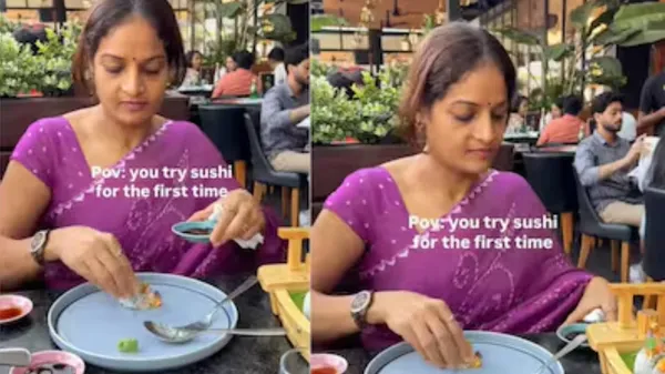 ಸಾಂಪ್ರದಾಯಿಕವಾಗಿ, ಸುಶಿಯನ್ನು ಚಾಪ್ಸ್ಟಿಕ್ಗಳನ್ನು ಬಳಸಿ ಸೇವನೆ ಮಾಡಲಾಗುತ್ತದೆ. ಅದರಲ್ಲೂ ಸೋಯಾ ಸಾಸ್ನಲ್ಲಿ ಲಘುವಾಗಿ ಅದ್ದಿ ತಿನ್ನುವುದು ಸಾಮಾನ್ಯ ವಿಧಾನ. ಆದರೆ ಈ ವೈರಲ್ ಕ್ಲಿಪ್ ತುಂಬಾ ವಿಭಿನ್ನವಾದ ವಿಧಾನವನ್ನು ತೋರಿಸುತ್ತದೆ. ವೀಡಿಯೊದಲ್ಲಿ, ಮಹಿಳೆ ತನ್ನ ಕೈಗಳಿಂದ ಸುಶಿಯ ತುಂಡನ್ನು ತೆಗೆದುಕೊಂಡು ಅದನ್ನು ತನ್ನ ತಟ್ಟೆಯಲ್ಲಿ ಇಡುತ್ತಾಳೆ. ಎಲ್ಲವೂ ಸಾಮಾನ್ಯವಾಗಿದೆ ಎಂದು ನಾವು ಭಾವಿಸಿದಾಗ ಆಕೆ ಅದನ್ನು ಬೆರಳುಗಳಿಂದ ನುಣ್ಣಗೆ ಕೈಯಿಂದಲೇ ಪುಡಿಯಾಗಿ ಹಿಸುಕುತ್ತಾಳೆ.
