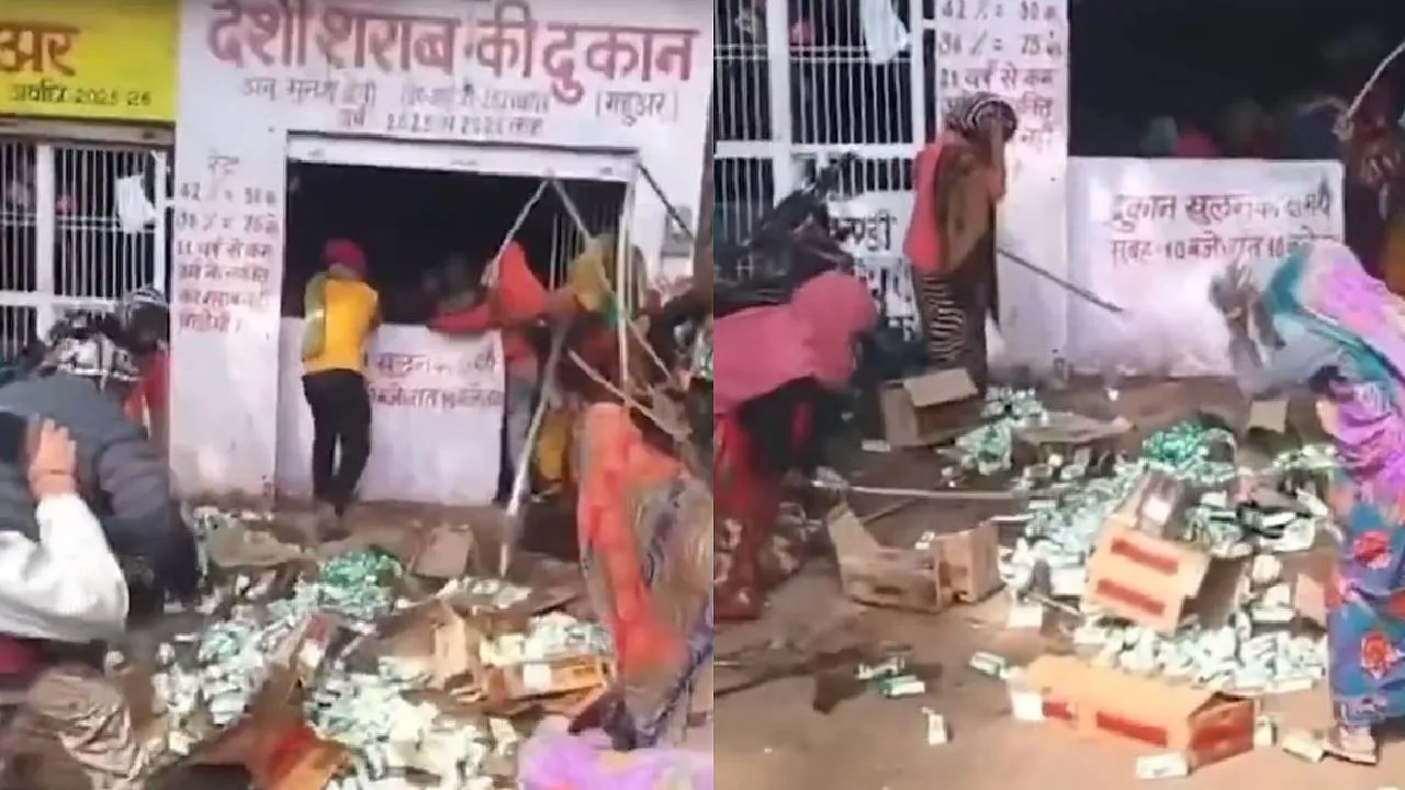 ಮದ್ಯದಂಗಡಿಗೆ ನುಗ್ಗಿ ಬಾಟಲಿ ಪುಡಿ ಪುಡಿ ಮಾಡಿದ ನಾರಿಮಣಿಗಳು; ವಿಡಿಯೋ ವೈರಲ್