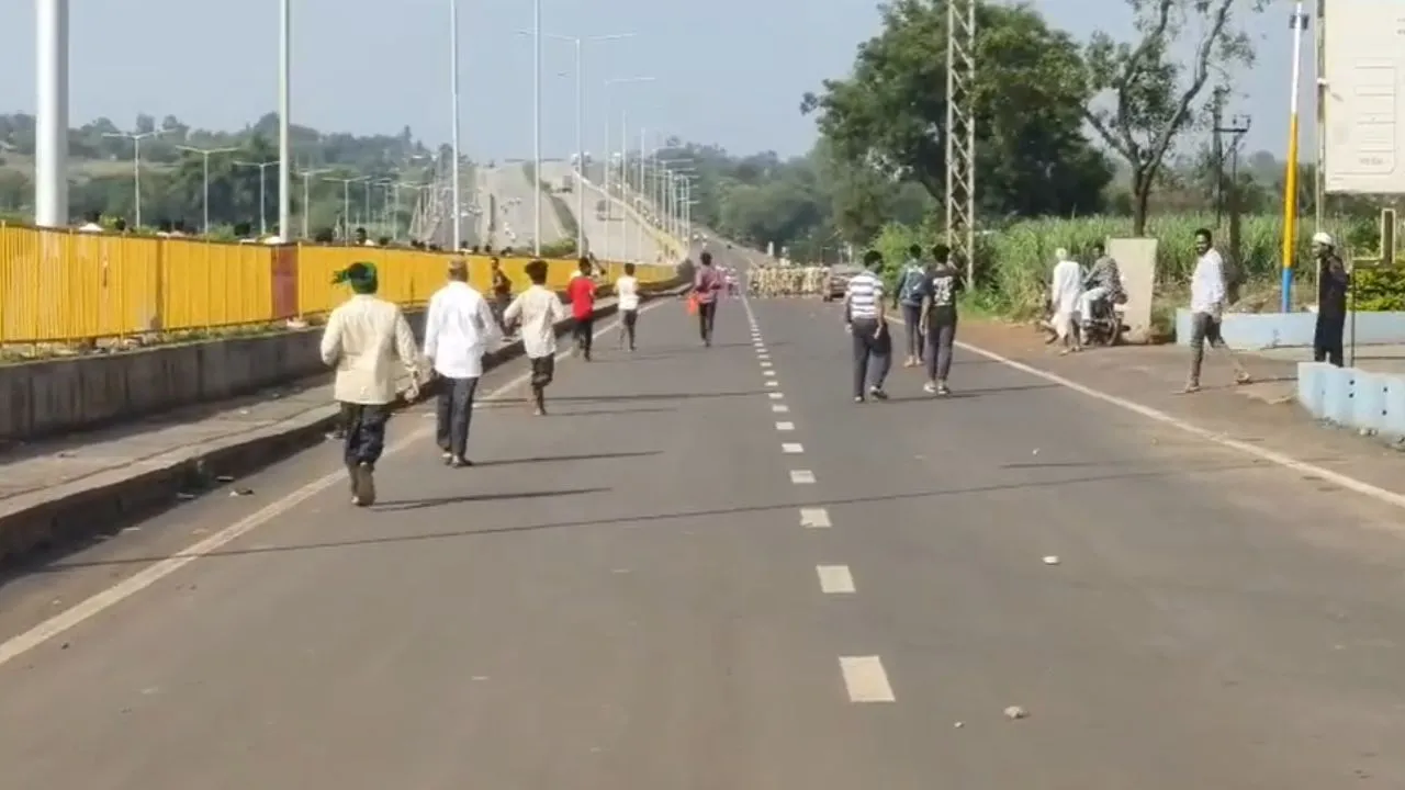 ಬೆಳಗಾವಿ ಜಿಲ್ಲೆಯ ಹುಕ್ಕೇರಿ ತಾಲೂಕಿನ ಹತ್ತರಗಿ ಟೋಲ್ ಗೇಟ್ ಬಳಿ ಪೊಲೀಸರನ್ನು ಬೆನ್ನಟ್ಟಿ ಕಲ್ಲು ತೂರಿದ ಪ್ರತಿಭಟನಾಕಾರರು. -