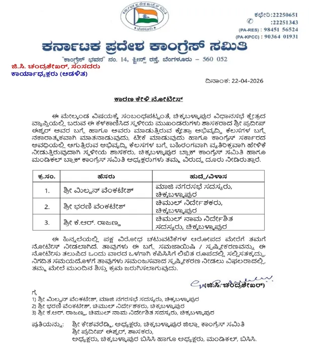 ಈ ಹಿನ್ನೆಲೆಯಲ್ಲಿ ಪಕ್ಷ ವಿರೋಧಿ ಚಟವಟಿಕೆಗಳ ಆರೋಪದ ಮೇಲೆ ತಮಗೆ ನೋಟೀಸು ನೀಡಲಾ ಗಿದೆ. ತಾವುಗಳು ಈ ಬಗ್ಗೆ ಸಮಜಾಯಿಷಿ/ಸ್ಪಷ್ಟೀಕರಣವನ್ನು ಈ ನೋಟೀಸು ತಲುಪಿದ ಒಂದು ವಾರದೊಳಗಾಗಿ ಕೆಪಿಸಿಸಿಗೆ ಲಿಖಿತ ರೂಪದಲ್ಲಿ ಸಲ್ಲಿಸತಕ್ಕದ್ದು.ನಿಗದಿತ ಸಮಯದೊಳಗೆ ತಾವುಗಳು ಸಮಂಜಸವಾದ ಸ್ಪಷ್ಟೀಕರಣ ನೀಡಲು ವಿಫಲರಾದಲ್ಲಿ ತಮ್ಮ ಮೇಲೆ ಮುಂದಿನ ಶಿಸ್ತು ಕ್ರಮ ಜರುಗಿಸಲಾಗುವುದು ಎಂದು ಬರೆದು ಸಂಬAಧಪಟ್ಟವರಿಗೆ ನೋಟಿಸು ನೀಡಿದ ಹಾಗೆ ಪ್ರತಿಗಳನ್ನು ಕೇಶವರೆಡ್ಡಿ ಕೆಪಿಸಿಸಿ ಜಿಲ್ಲಾಧ್ಯಕ್ಷರು ಚಿಕ್ಕಬಳ್ಳಾಪುರ, ಶಾಸಕರು ಪ್ರದೀಪ್ ಈಶ್ವರ್, ಅಧ್ಯಕ್ಷರು ಬಿಬಿಸಿ ಚಿಕ್ಕಬಳ್ಳಾಪುರ, ಮಂಡಿಕಲ್ ಬಿಸಿಸಿ ಅಧ್ಯಕ್ಷರಿಗೆ ನೀಡಲಾಗಿದೆ.