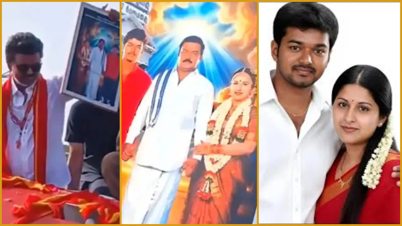 Thalapathy Vijay: ಟಿವಿಕೆ (TVK) ಪಕ್ಷದ ಚುನಾವಣಾ ಪ್ರಚಾರದ ವೇಳೆ ಅಭಿಮಾನಿಯೊಬ್ಬರು ನಟ ವಿಜಯ್ ಮತ್ತು ಅವರ ಪತ್ನಿ ಸಂಗೀತಾ ಅವರ ಮದುವೆಯ ಎಡಿಟೆಡ್ ಫೋಟೋ ಫ್ರೇಮ್ ಅನ್ನು ಉಡುಗೊರೆಯಾಗಿ ನೀಡಿದ್ದಾರೆ. ಪತ್ನಿ ವಿಚ್ಛೇದನಕ್ಕೆ ಅರ್ಜಿ ಸಲ್ಲಿಸಿರುವ ಸಂಕಷ್ಟದ ಸಮಯದಲ್ಲೂ ಆ ಫೋಟೋವನ್ನು ಪ್ರೀತಿಯಿಂದ ಪಡೆದು, ಅಭಿಮಾನಿಗಳತ್ತ ಕೈ ತೋರಿಸಿದ್ದಾರೆ ವಿಜಯ್.