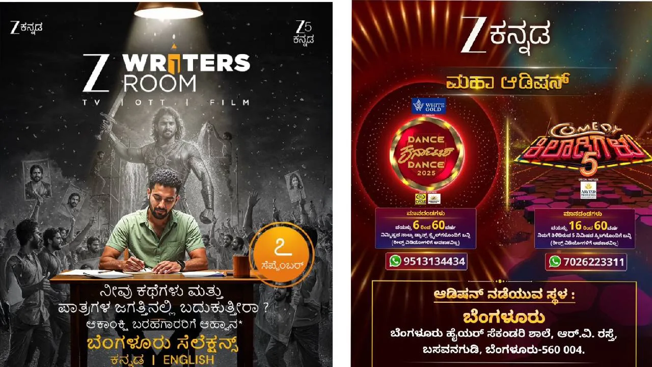 Zee Kannada: ಸೆಪ್ಟೆಂಬರ್ 7ಕ್ಕೆ ಝೀ ರೈಟರ್ಸ್ ರೂಮ್, ಡಾನ್ಸ್ ಕರ್ನಾಟಕ ಡಾನ್ಸ್, ಕಾಮಿಡಿ ಕಿಲಾಡಿಗಳು ಆಡಿಷನ್ಸ್