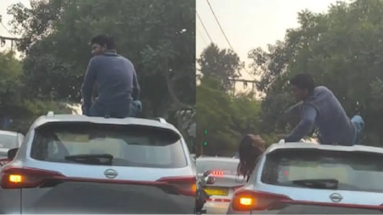 ವೈರಲ್ ಆದ ವಿಡಿಯೋದಲ್ಲಿ 21 ವರ್ಷ ವಯಸ್ಸಿನ ಯುವಕನು ಕಾರಿನ ಟಾಪ್ ಮೇಲೆ ಹತ್ತಿ ಕೂತಿದ್ದಾನೆ. ಕಾರು ಚಲಿಸುತ್ತಿದ್ದಾಗಲೇ ಈ ಹುಡುಗ ಕಾರಿನ ಮೇಲೆ ಸಾಹಸ ಮೆರೆದಿದ್ದಾನೆ. ಈ ಆಘಾತಕಾರಿ ದೃಶ್ಯಗಳು ಜನರನ್ನು ಬೆಚ್ಚಿ ಬೀಳಿಸುವಂತಿದೆ. ಕಾರಿನ ಟಾಪ್ ನಲ್ಲಿ ಯಾವುದೇ ಭದ್ರತೆಗಳಿಲ್ಲದೆ ಹುಡುಗ ಕೂತಿದ್ದಾನೆ. ಬಳಿಕ ಟ್ರಾಫಿಕ್ ಸಿಗ್ನಲ್ನಲ್ಲಿ, ಹುಡುಗಿಯೊಬ್ಬಳು ಕಾರಿನ ಕಿಟಕಿಯಿಂದ ಹೊರಗೆ ಬಾಗಿದ್ದಾಳೆ. ಇಬ್ಬರು ಮುತ್ತು ಕೊಟ್ಟು ಚುಂಬಿಸುತ್ತಿರುವ ದೃಶ್ಯಗಳು ಕಂಡು ಬಂದಿದ್ದು ನೆಟ್ಟಿಗರು ಆಕ್ರೋಶ ವ್ಯಕ್ತಪಡಿಸಿದ್ದಾರೆ.